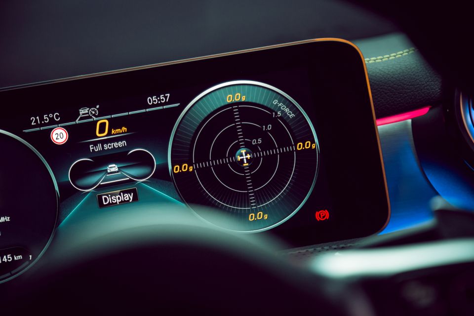 The instrument screen shares a glass cover with the centre touchscreen infotainment system and houses the AMG Track Pace display, billed as a “virtual race engineer”.
