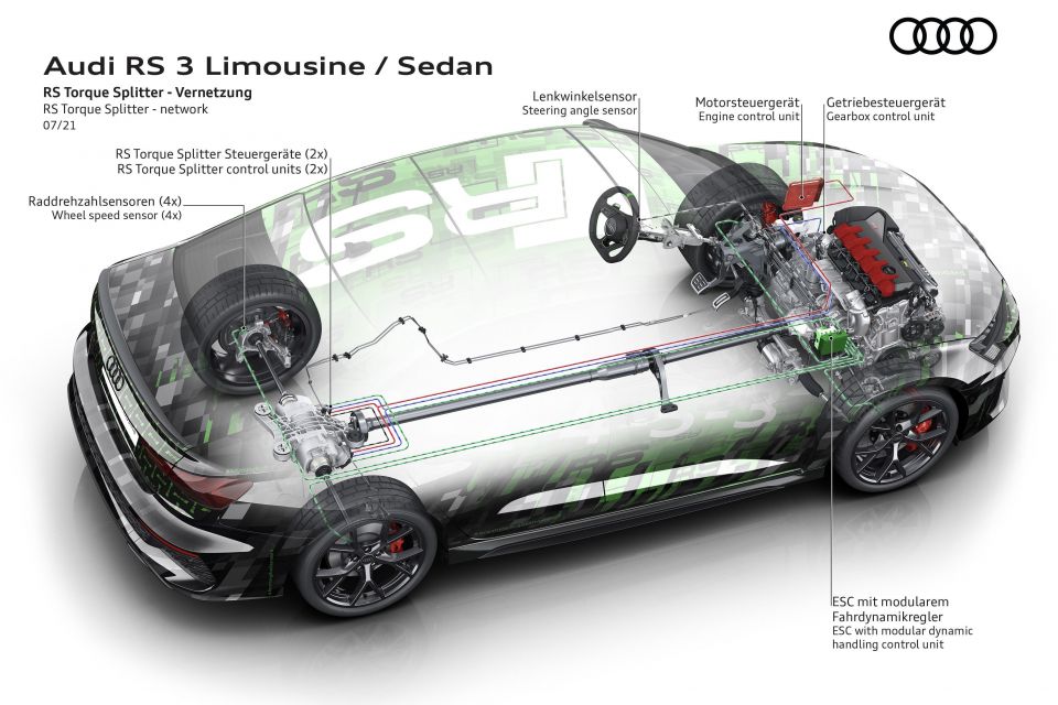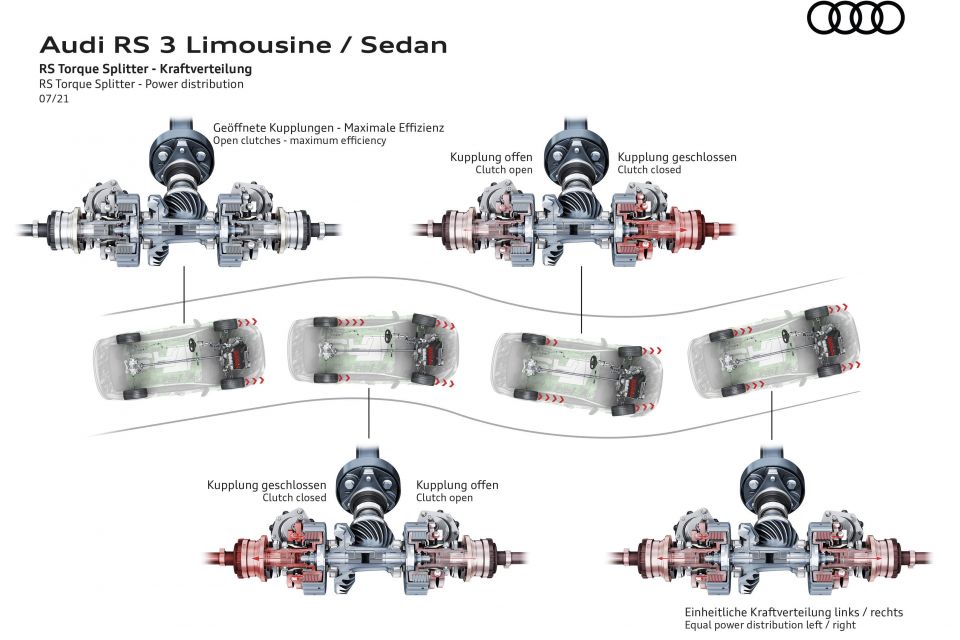 Headline news is the RS brand-first torque splitter device, which works a little differently to a normal rear differential and clutch pack. It allows rapid variable torque vectoring along the rear axle, for example transmitting torque to the right rear wheel in lefthand curves.