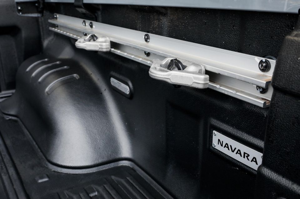 The Nissan also gets rails running along the tub sidewalls with moveable tie-down points, and a counterweighted tailgate. The Isuzu counters this with a sliding hard tonneau cover.