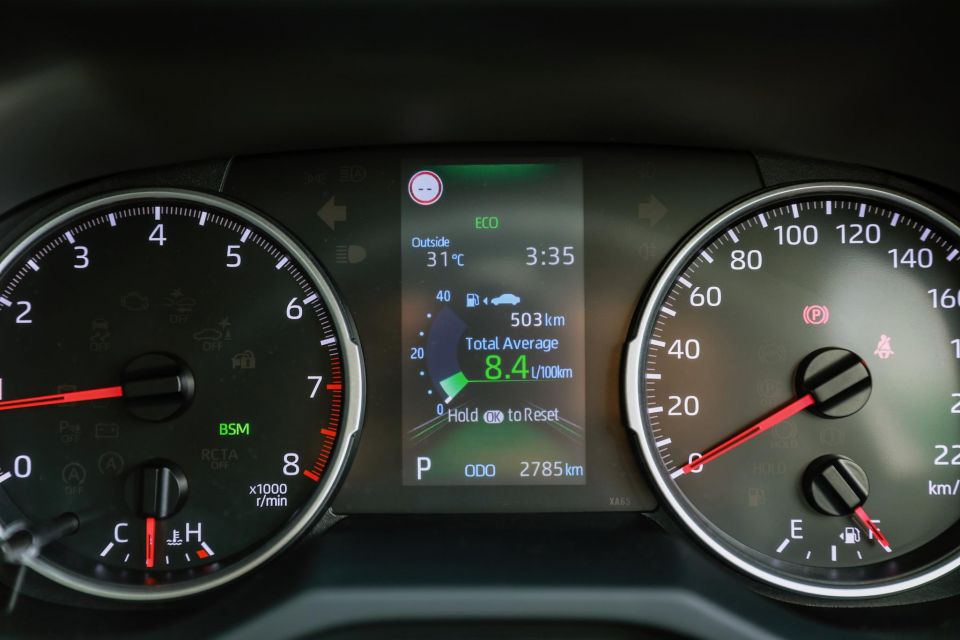 Toyota claims the 2.0-litre in the RAV4 petrol uses 6.5 litres of 91 RON per 100km while the other car in our test, the 2.5-litre RAV4 Hybrid AWD, is rated at 4.8L/100km.