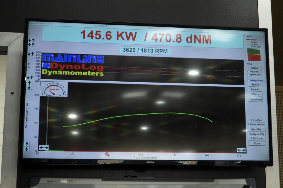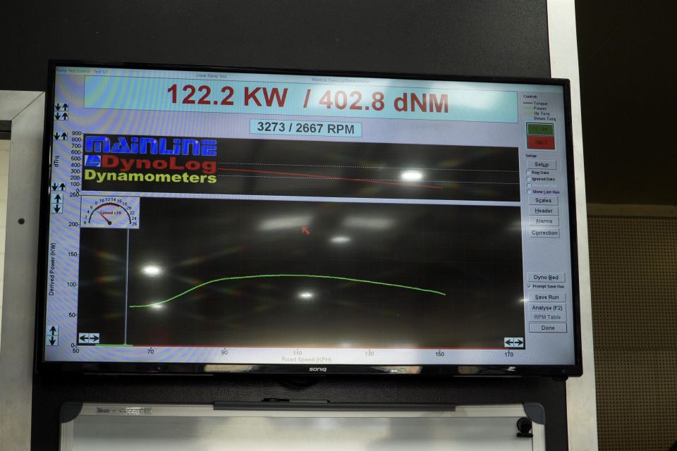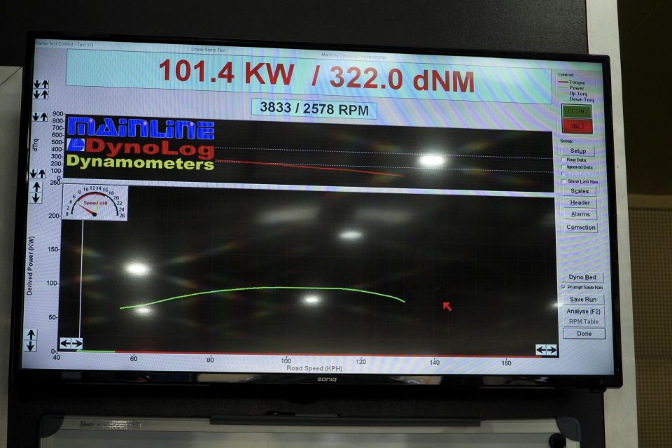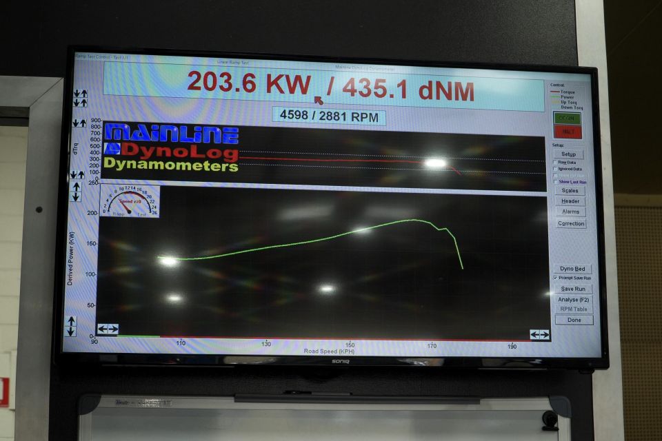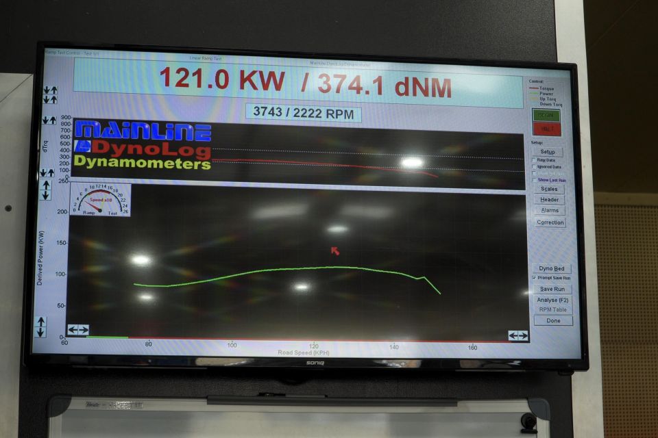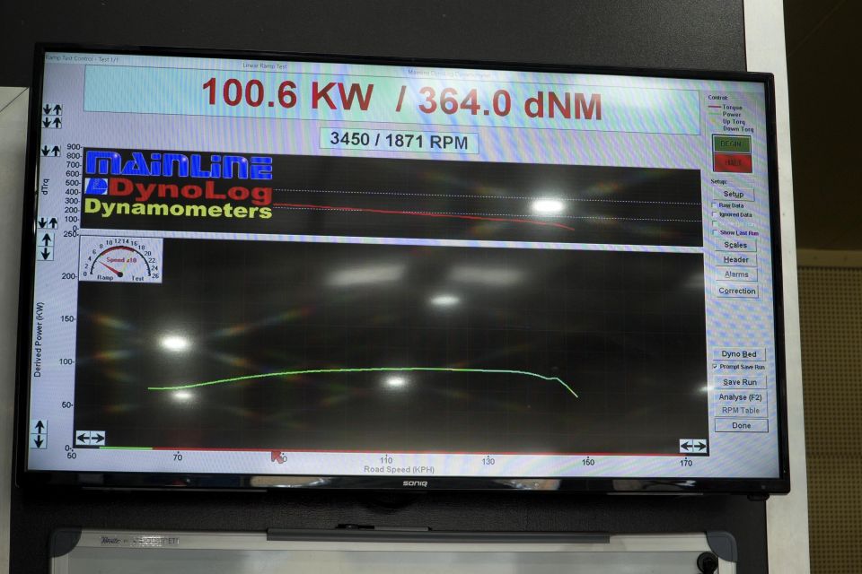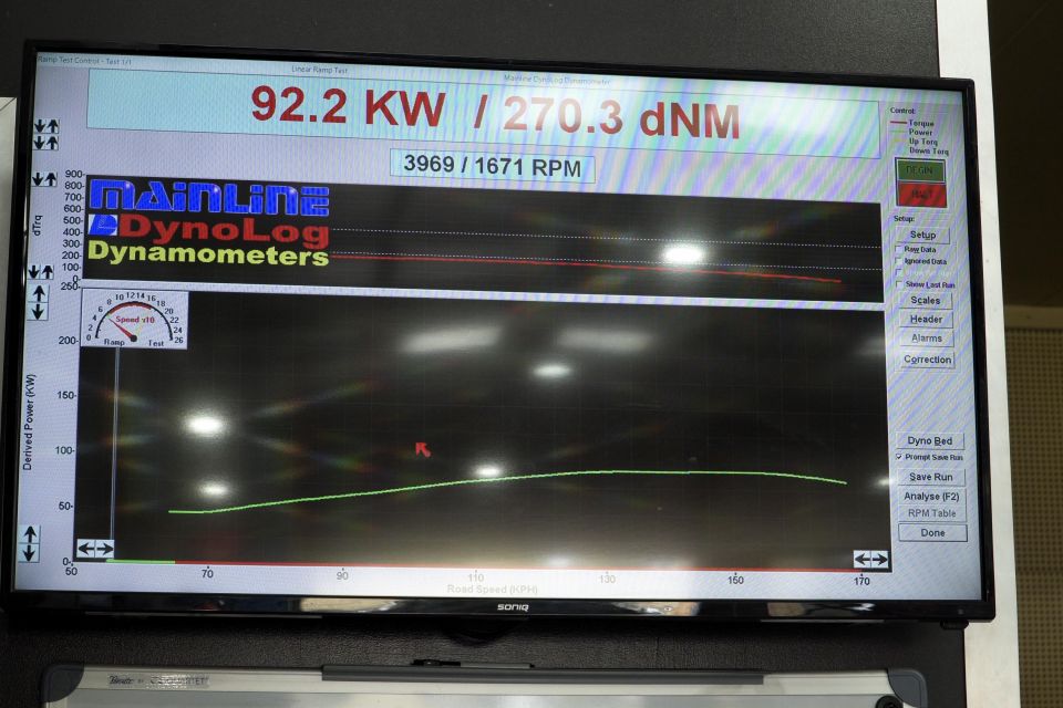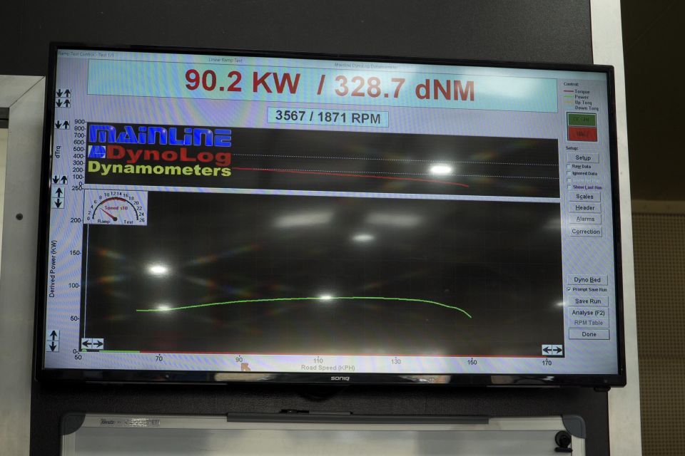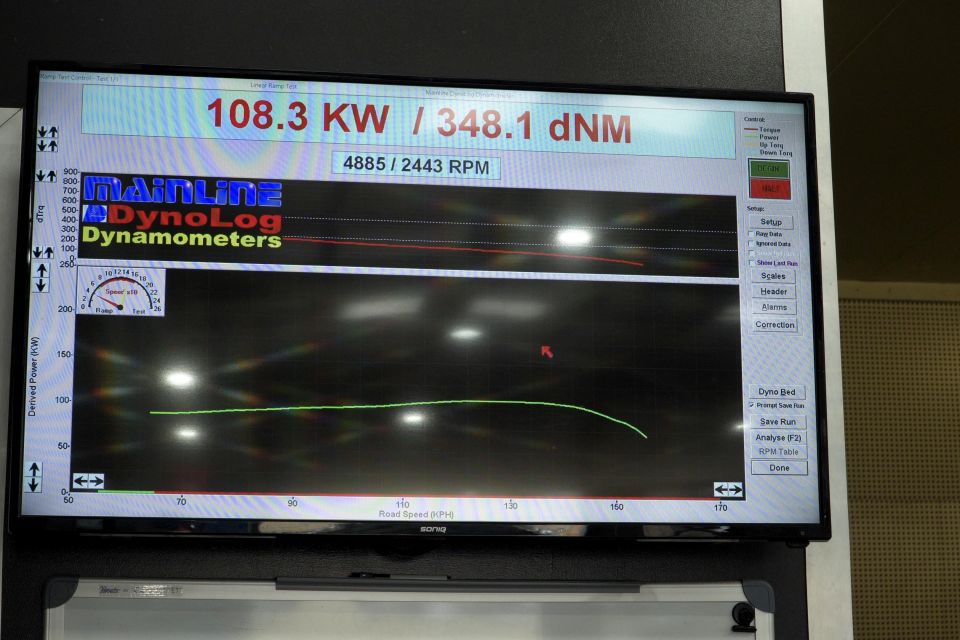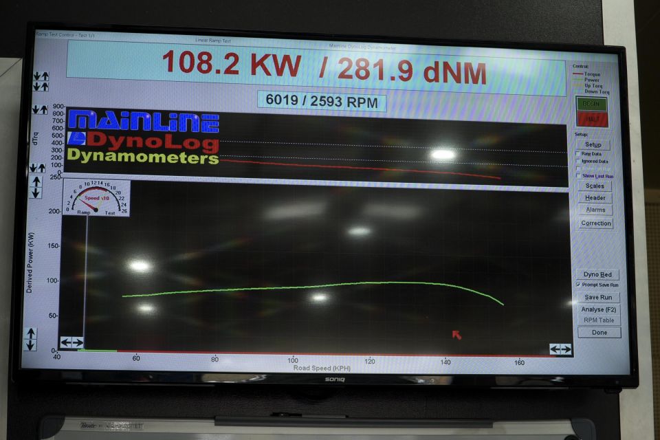 Each ute was backed onto the rolling dyno, with the back wheels rotating at full throttle. The machine then spits out a power result.
