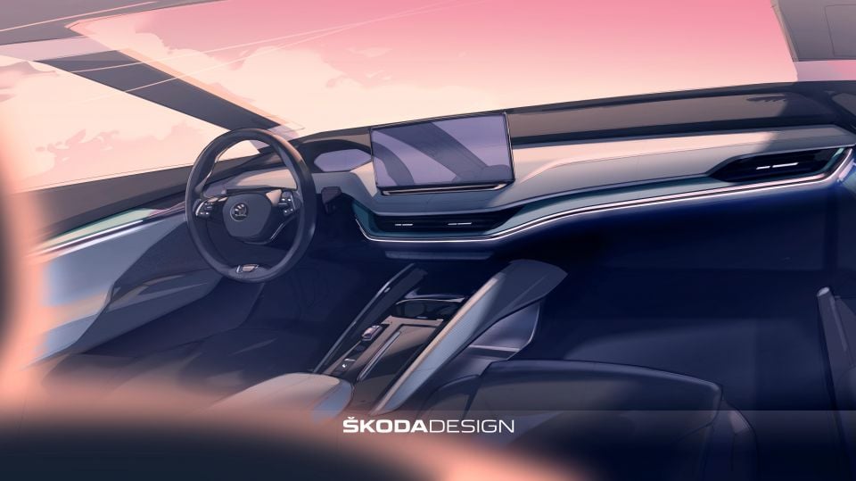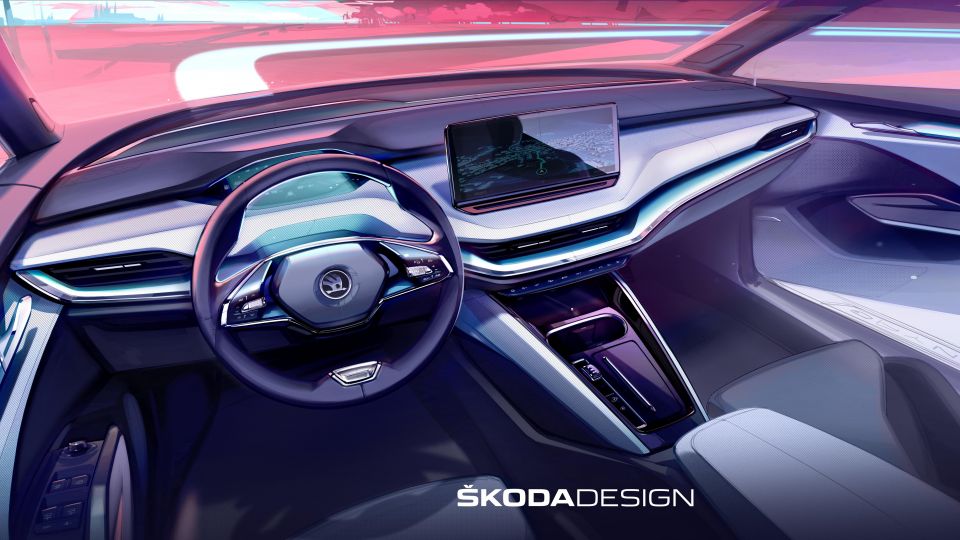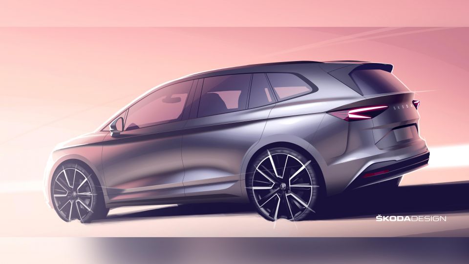 Two different alloy wheel designs can be seen in the exterior images, with the rims in the sketches on pink backgrounds appearing more indicative of the final design and proportion with relation to the Enyaq’s body.