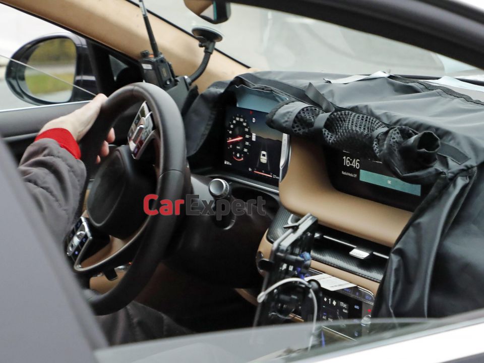Our photography agency also managed to snap a few shots of the sedan’s interior, which features a distinctive two-spoke steering wheels, and two large displays separated by a sweep of leather and metal.