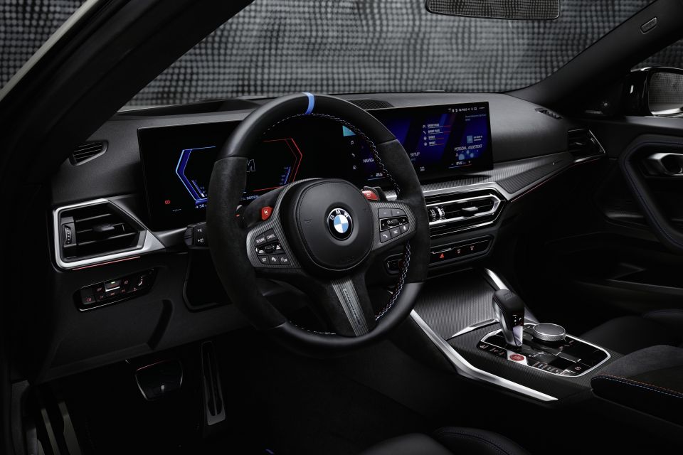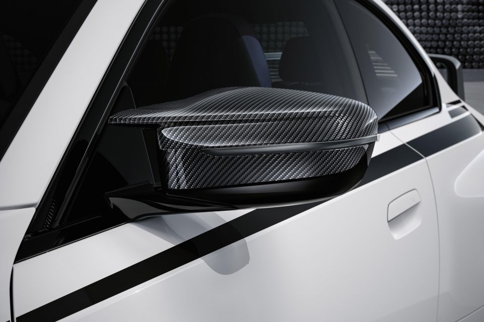 On the inside the M2 can be fitted out with carbon fibre and Alcantara interior trim panels, Alcantara knee pads, an Alcantara armrest, carbon fibre sill trims, and velour floor mats.