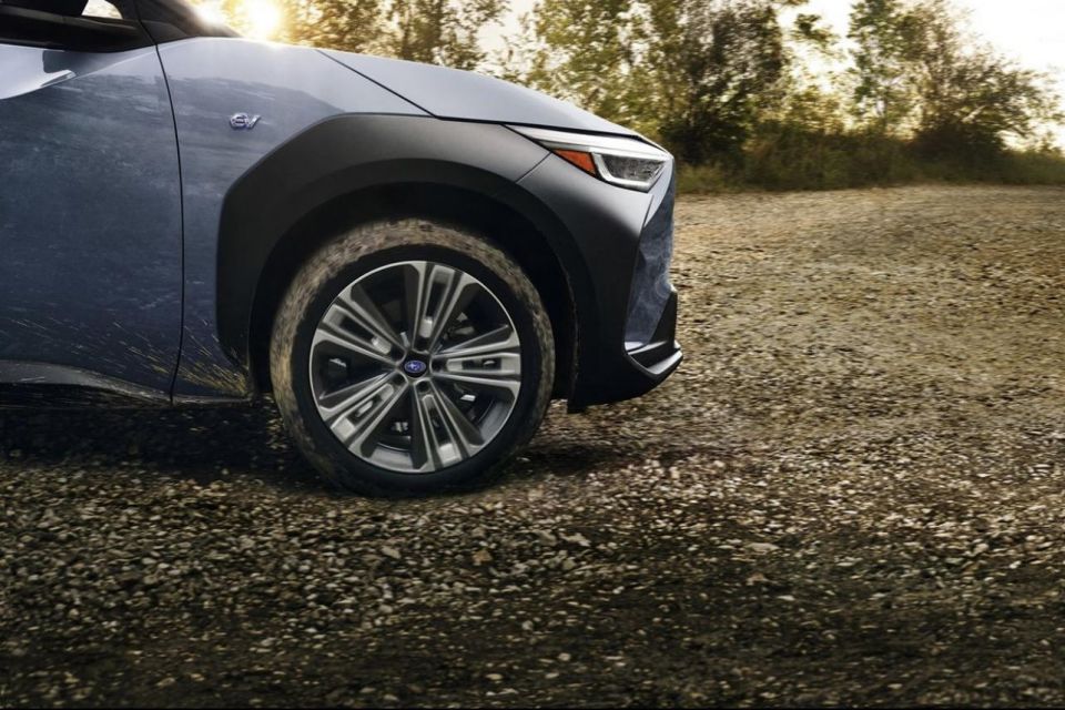 The teaser image was shared on Subaru of America’s Instagram and shows a close up of the front right-hand wheel with its rounded wheel arch, expansive wheel cladding and prominent ‘EV’ badge.