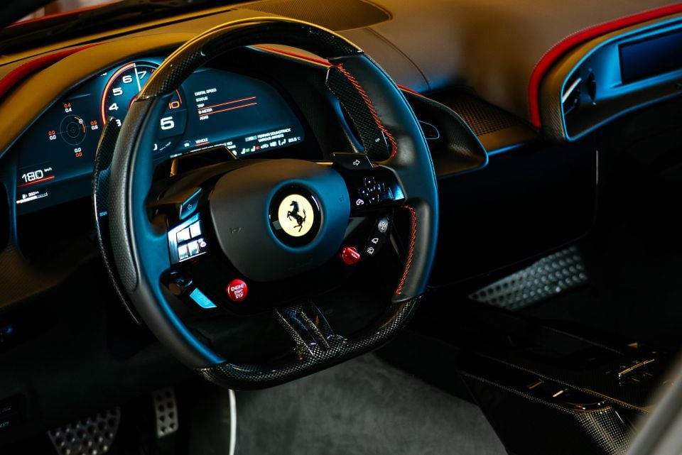 A similar theme is applied at the rear, where the tail-lights are hidden within what Ferrari refers to as “graphical cuts”. An active rear spoiler with three positions – Low Drag, Medium Downforce and High Downforce – is neatly integrated into the rump, and in its most aggressive setting it’s claimed to generate 110kg of downforce over the rear axle at 250km/h.