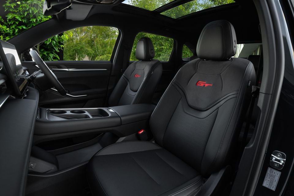 The Haval H6 GT PHEV continues to have a 10.25-inch digital instrument cluster, but the gear shifter moves up to the steering column and there’s a selection of “higher-quality materials”. The GT continues to differ from the standard Haval H6 range with its suede upholstery.