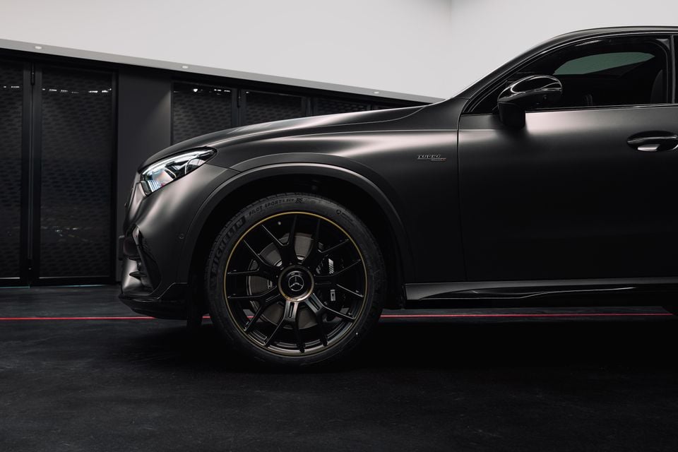 Available only with Obsidian Black or Graphite Grey Magno exterior finishes, this package brings Techgold exterior accents, including on the rim flanges of the matte black 21-inch AMG forged wheels, behind which sit gloss black brake calipers with white AMG lettering.