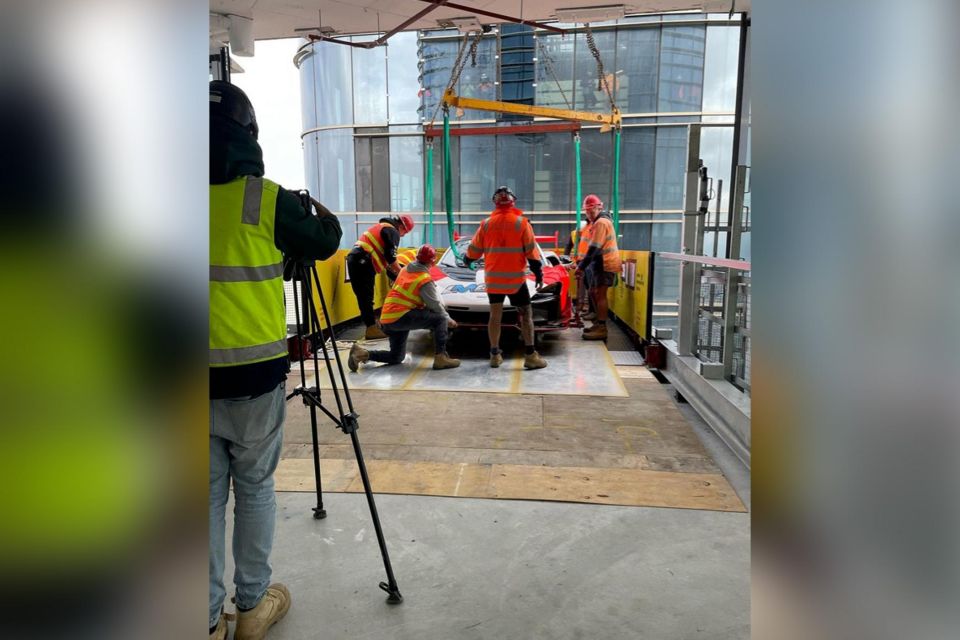 A video shows the supercar in the air. An eight-man crew carefully wheeled the vehicle into the apartment via a glass opening.
