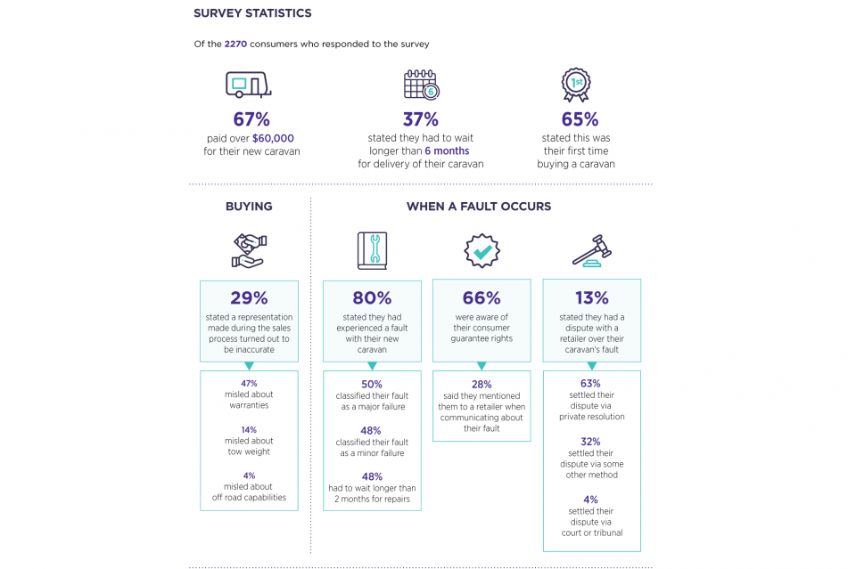 It said it surveyed 2270 owners, of which 29 per cent said the seller made a misrepresentation during the sales process, including around their consumer guarantee and warranty rights and their caravan’s tow weight.