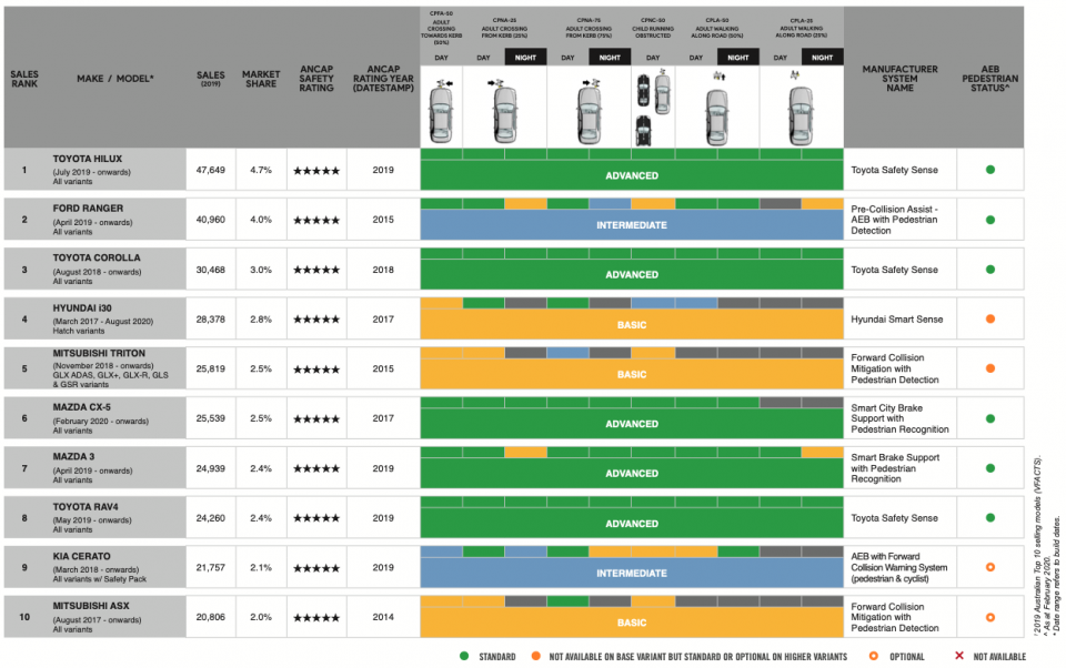 Autonomous emergency braking is a lifesaver, both for occupants and pedestrians. Here's how the 10 best-selling cars in Australia last year stack up.