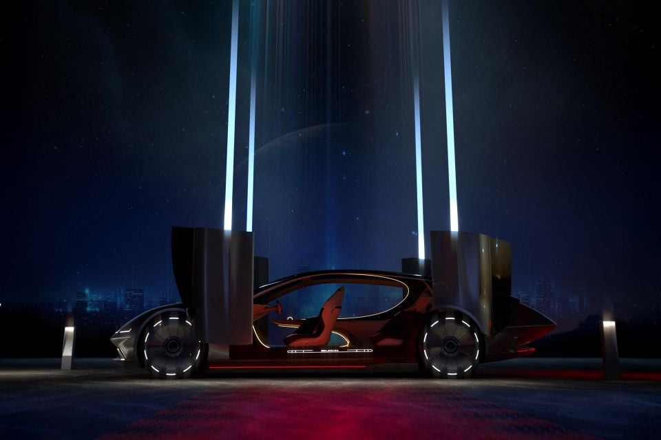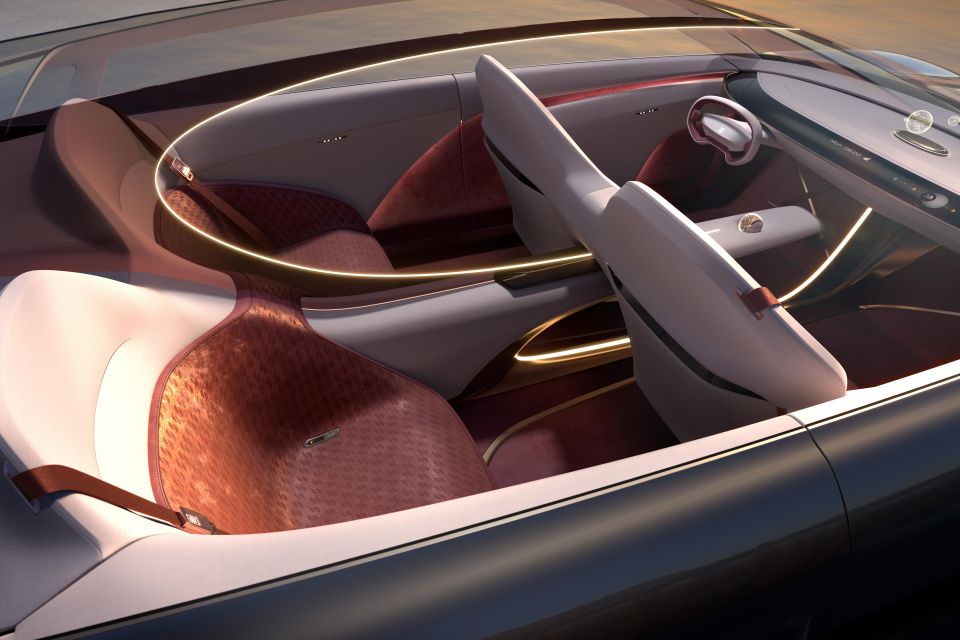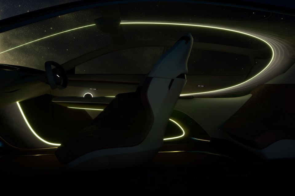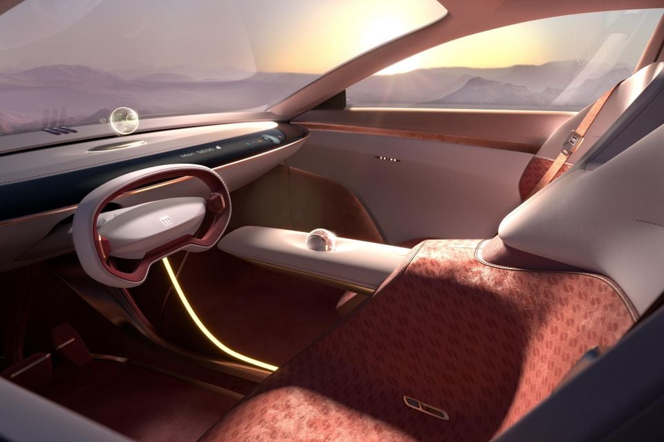 Dramatically arched ambient lighting strips grace the cabin, while the seats are finished in “opulent fabrics” with a brocade pattern – another very 1950s touch, if in a different way to the Space Age exterior – in colours inspired by rich red clay.