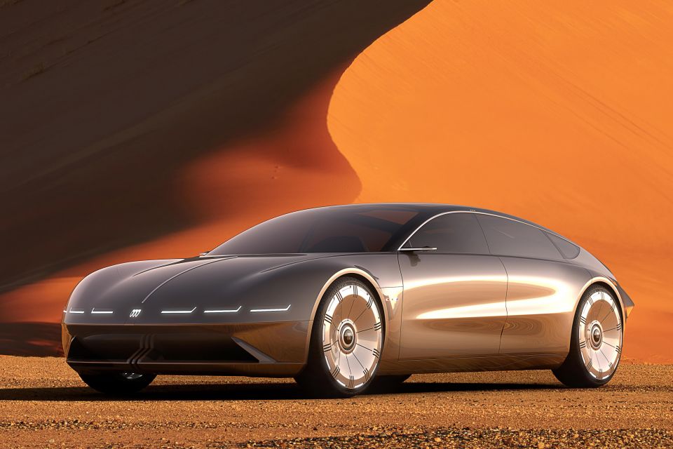 Designers drew inspiration from “space-age spacecraft, jets, and iconic Buick concepts of the 1950s”, with a rakish roofline, prominent shoulders, and a tapered, almost missile-like rea- end that gives the concept its most distinctive angle.