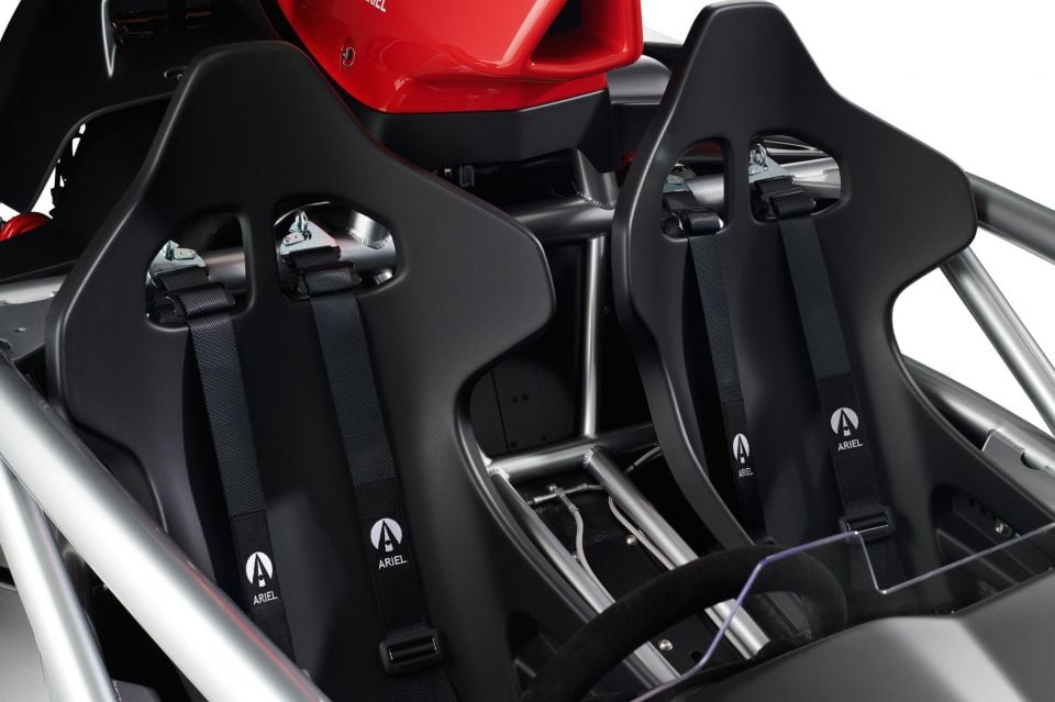 Inside the Atom 4 comes with two individual composite race seats with five-position adjustment, as well as four-point quick-release harnesses.