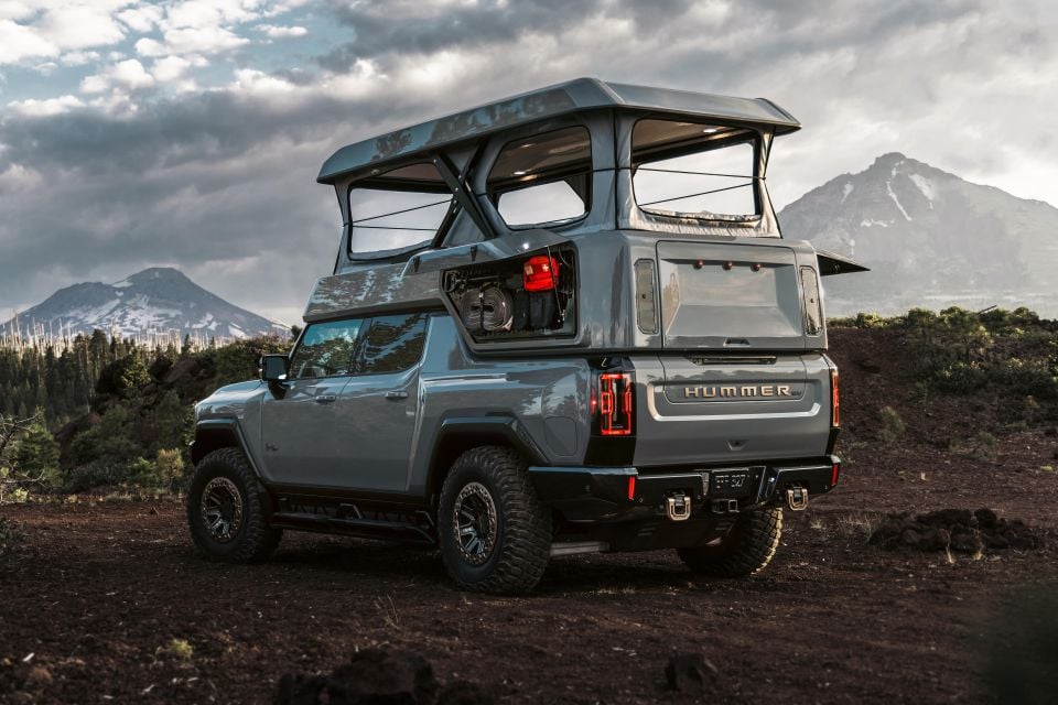 In doing so, EarthCruiser has taken a Hummer EV and added a carbon-fibre, camper-style module to the rear of the Hummer, complete with a roof-top tent.