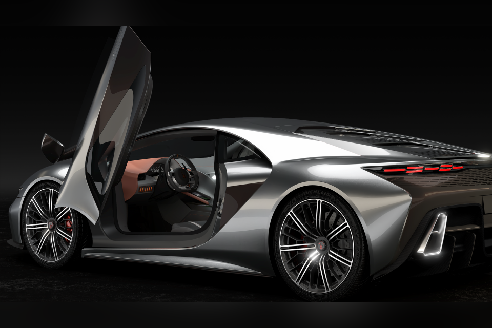 There’s a distinctive C-shape to the side, for a look somewhat reminiscent of the McLaren GT. There are a set of scissor doors and air vents that force air into the cooling system.