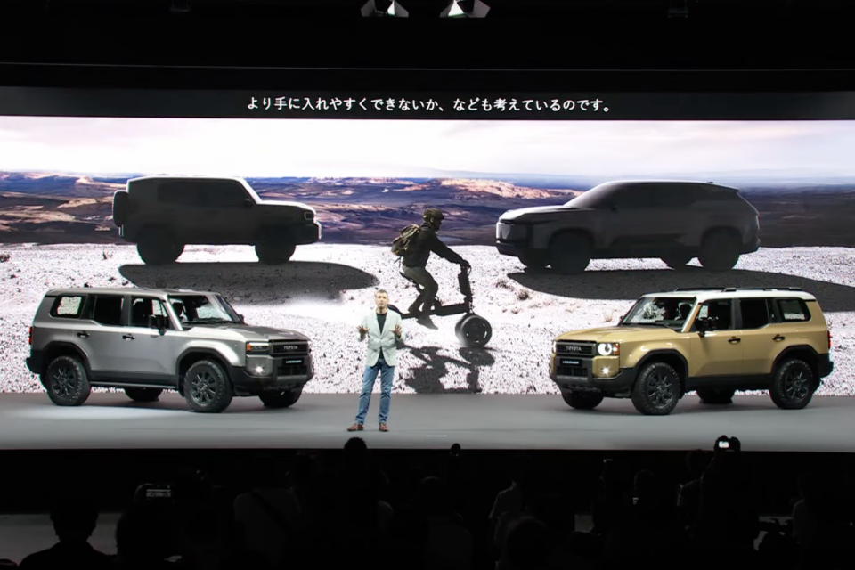 Toward the end of the presentation where two new LandCruiser Prados were on stage, a slide was projected on the backdrop that showed the shadowy silhouettes of two potential future LandCruiser SUVs, as well as a three-wheeled scooter.