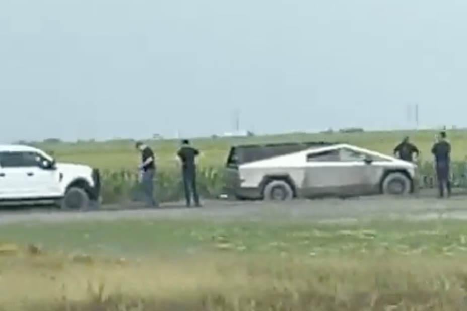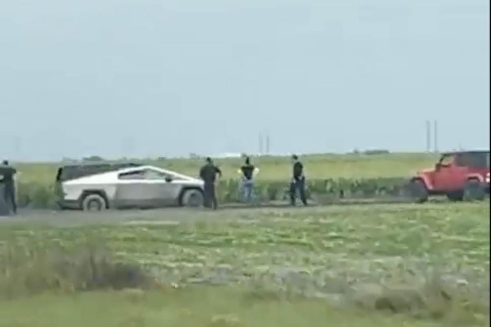 A driver in Texas has stumbled upon a Tesla Cybertruck stuck in the mud next to a Jeep Wrangler and Ford Super Duty.