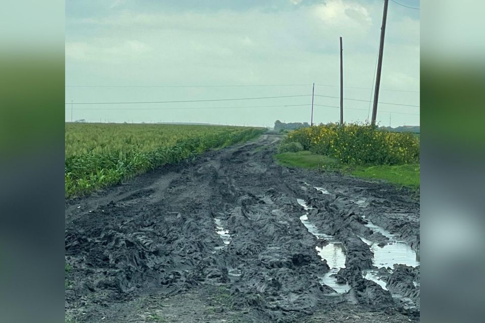 The video – although very shaky – shows the truck on the side of the road, lightly submerged in mud with several people standing nearby.