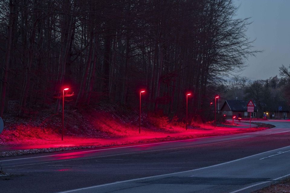 An area near Copenhagen is installing red LED street lights with smart tech to save wildlife and potentially interact with cars.