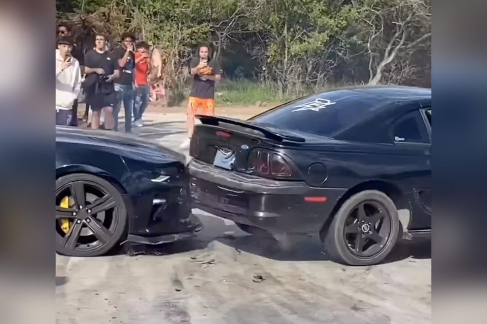 The driver appears to regain control and attempts to drive away, however a Ford Mustang – also in the ring – appears in front and is rear-ended by the Camaro.