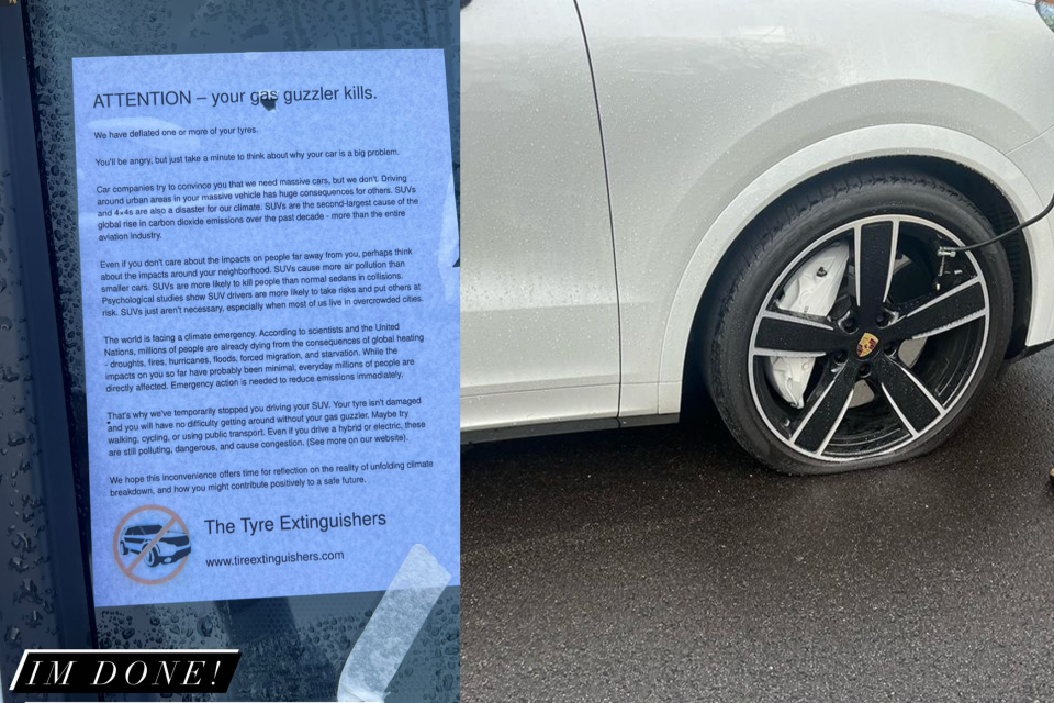 The radical movement is deflating tyres on “massive and unnecessary vehicles” in order to cause inconvenience to their owners. It believes the government and politicians have “failed to protect us” and is taking matters into its own hands.