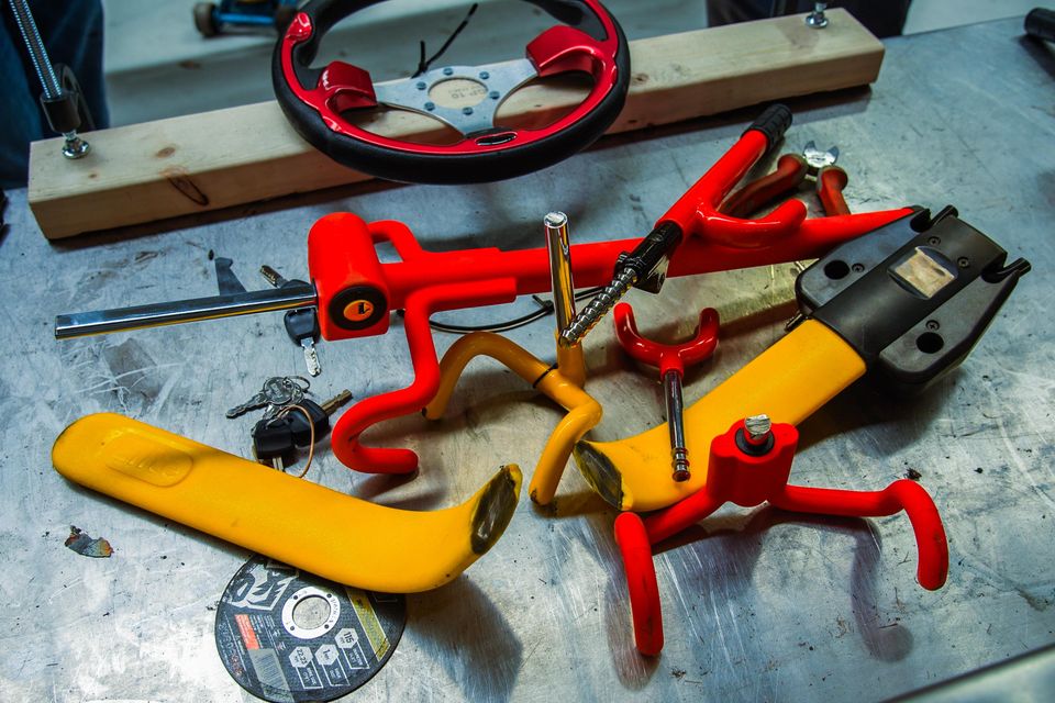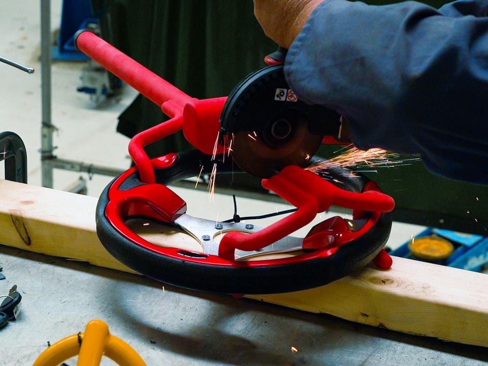 The setup was deliberately simple. A steering wheel mounted to a plank, each lock fitted as it would be on a car, and a battery-powered grinder like the kind you could realistically imagine being used in a driveway at 3:00am.