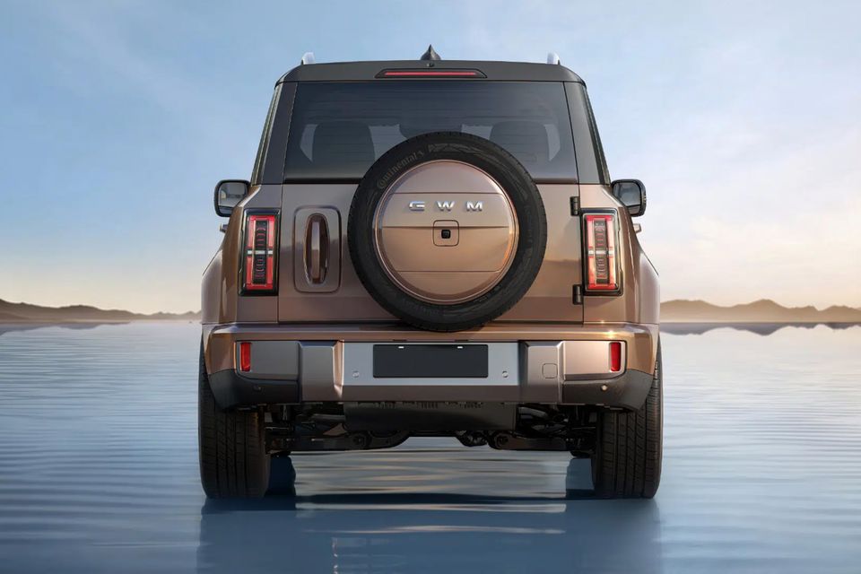 Its square-shouldered styling includes a Land Rover Defender-style stepped window line, flat roof and an externally mounted full-size spare wheel on a side-hinged tailgate.