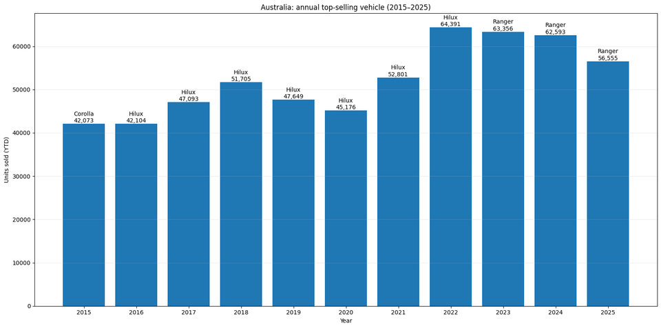 That pattern aligns neatly with the broader shift, as passenger cars shrank dramatically in popularity over the decade, while SUVs and light commercials expanded. The best-seller story is simply that shift expressed as a single line item: first a mainstream passenger nameplate (Corolla), then a ute (HiLux), then another ute (Ranger) that better matches where demand and product momentum sit in the 2020s.