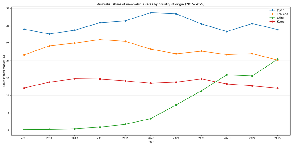 2025 saw China overtake Thailand as Australia's second largest supplier of new vehicles, though Japan remained on top.