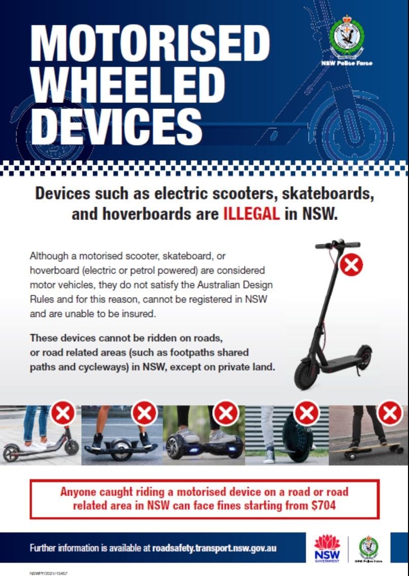 The NSW Road Rule 240(2)(c) specifically prohibits a person from travelling in or on a motorised wheeled recreational device on a road or public place. These include any device apart from approved e-bikes that are wholly or partly assisted by means other than human power.