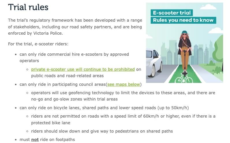 The trial will allow people to hire e-scooters and ride them on bicycle lanes, shared paths and lower speed roads (up to 50km/h).
