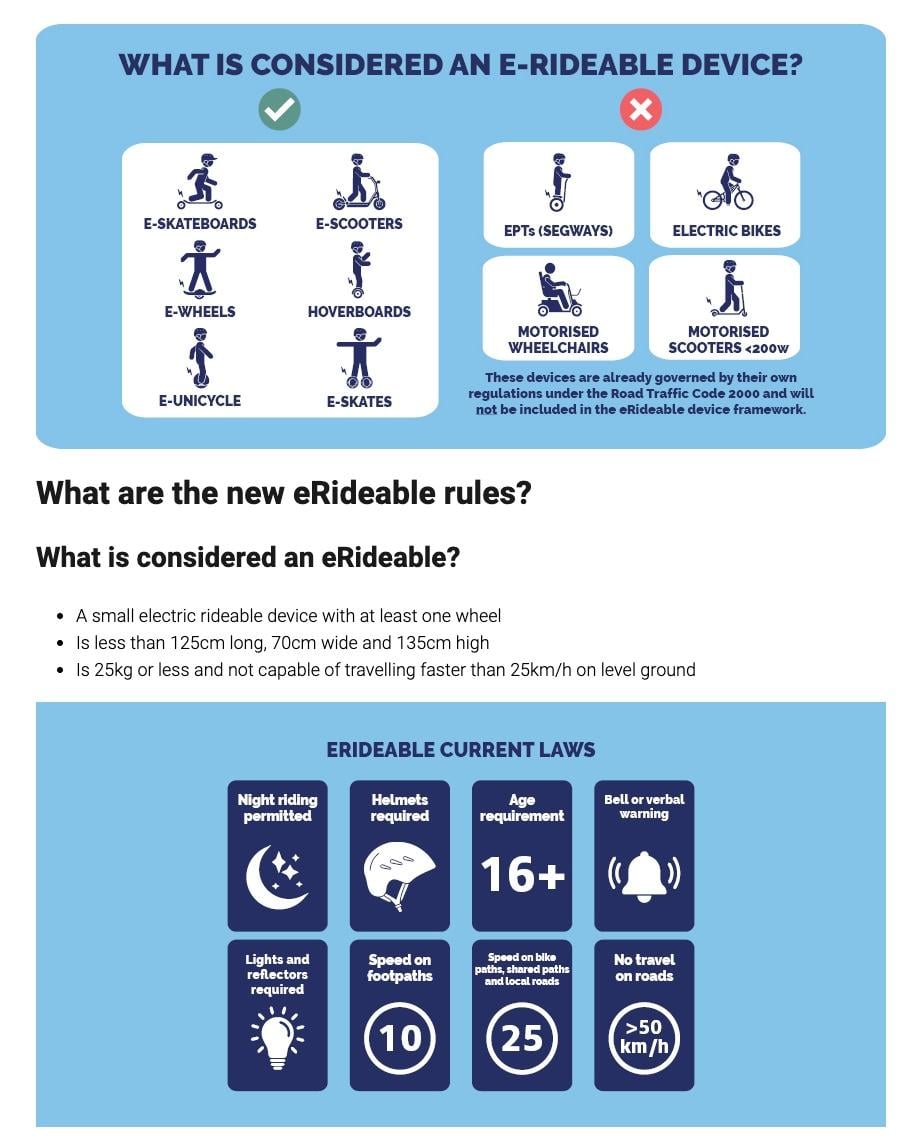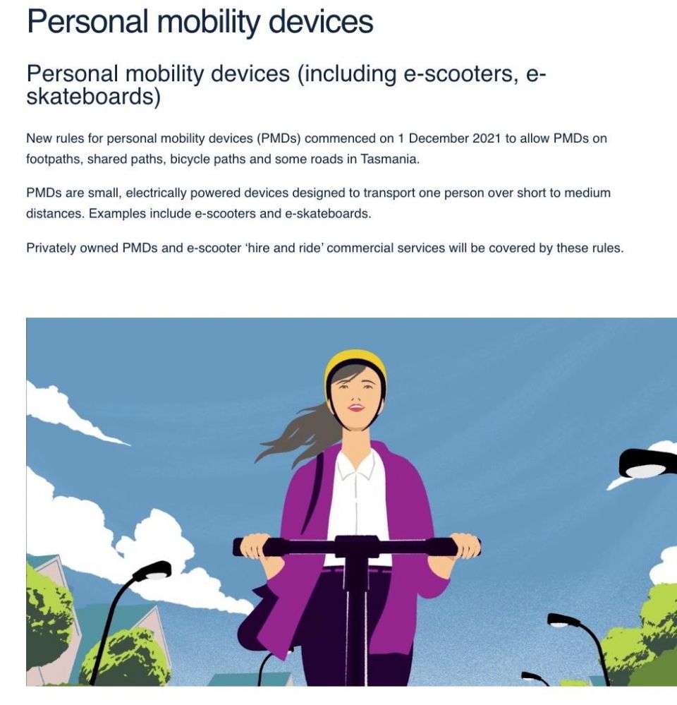 New rules for personal mobility devices (PMDs) commenced on 1 December 2021 to allow PMDs on footpaths, shared paths, bicycle paths and some roads in Tasmania. By Tasmania’s description a compliant PMD is a small electrically powered device designed to transport one person over short to medium distances.
