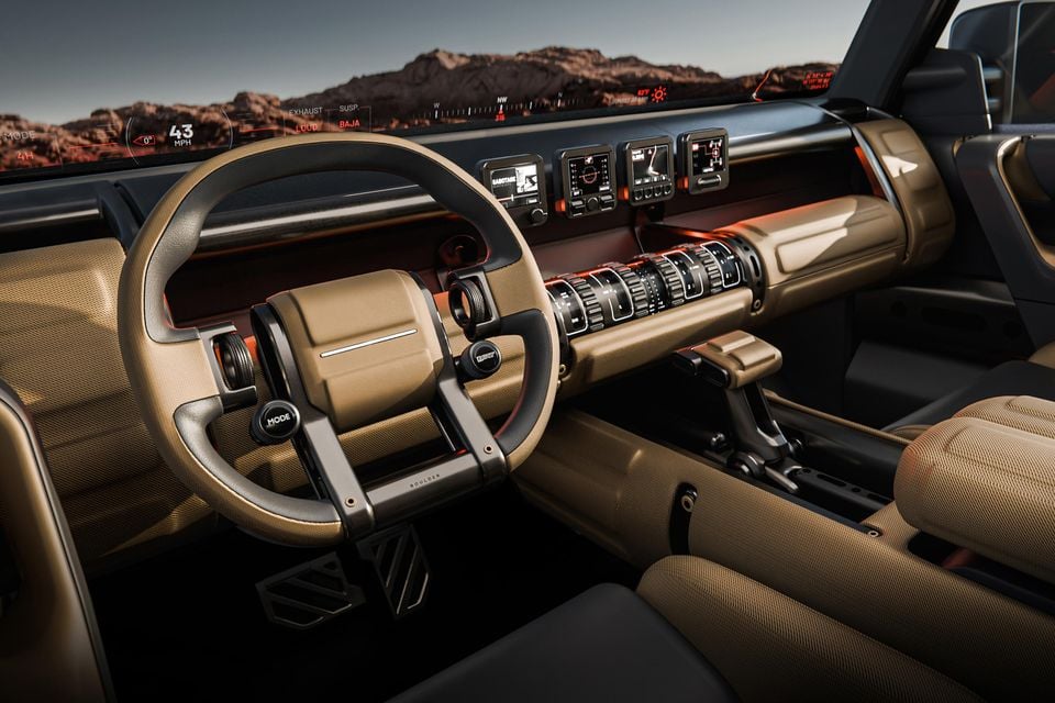 Inside, the sand-coloured cabin features configurable seating and a rounded dashboard, a head-up display along with a raft of physical buttons and off-road-focused details such as rugged grab handles, four small central displays, and large storage areas.