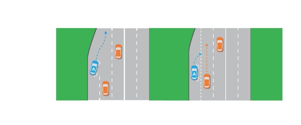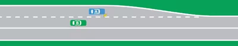 DIAGRAM 1: Sometimes the lane separation line will end and both lanes of traffic are required to merge into one lane. When merging in such cases, the vehicle that is ahead has the right of way over the trailing vehicle.