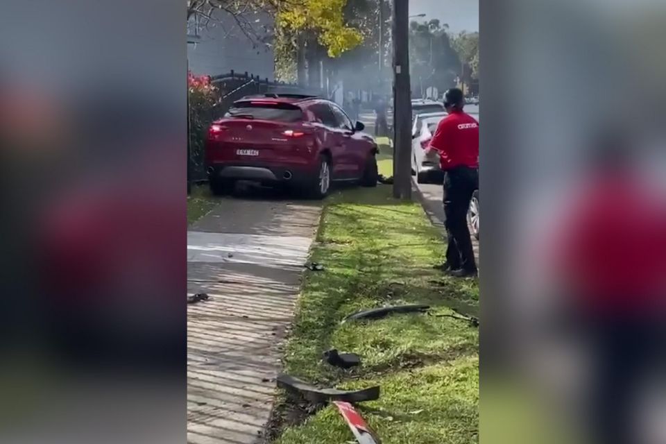 A shocking video shows an Alfa Romeo Stelvio driver mounting a kerb and running into fences and parked cars.