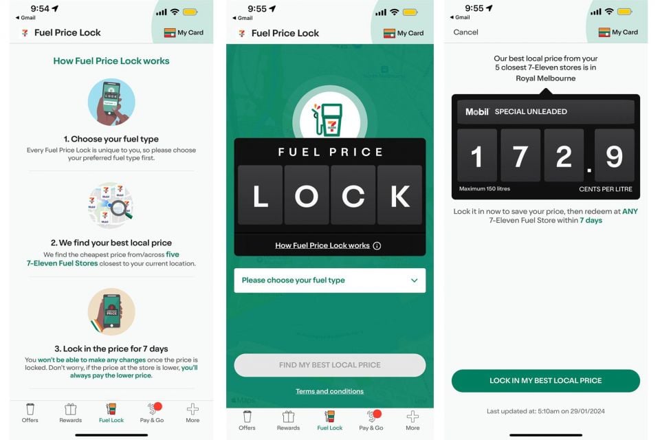 The Fuel Price Lock program allows users to search for the best price at the five closest 7-Eleven stores to their current location, within a 250km radius. Once a price is locked in by a user, it expires after seven days.