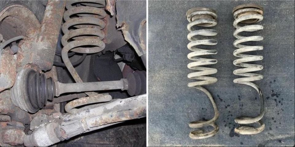 The stretched coil spring was used on the all-wheel-drive variant 4Matic model of the 124. The front suspension of the 4Matic model had to accommodate the front differential and driveshaft. To do this, the spring was stretched to provide enough clearance for the front differential.