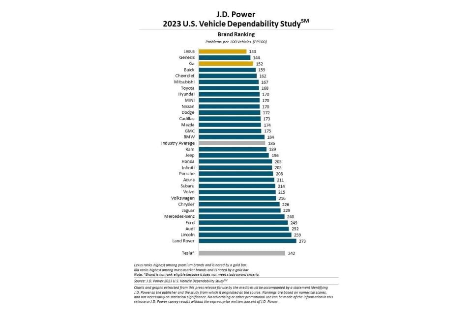 Bringing up the rear were Mercedes-Benz (240), Ford (249), Audi (252), Lincoln (259) and Land Rover (273).