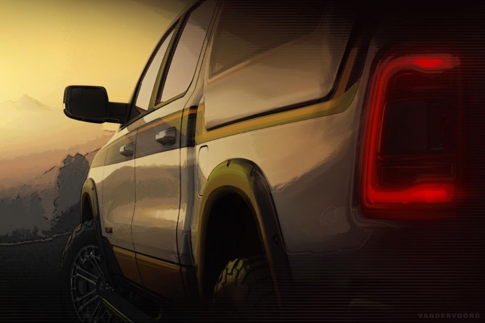 The two Ram teaser images may be of the same vehicle, with one showing the front of a 1500 and the other depicting a rear three-quarter view.