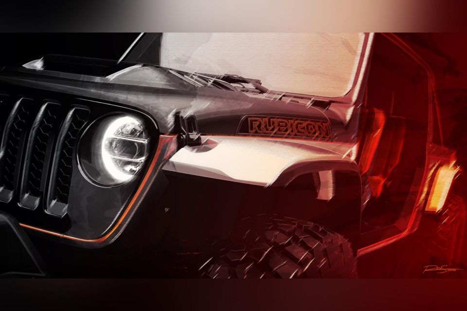 The teaser image shows are once again large, knobbly tyres and a Rubicon badge on the side of the bonnet. What sets this apart is its large side openings where the doors usually are.
