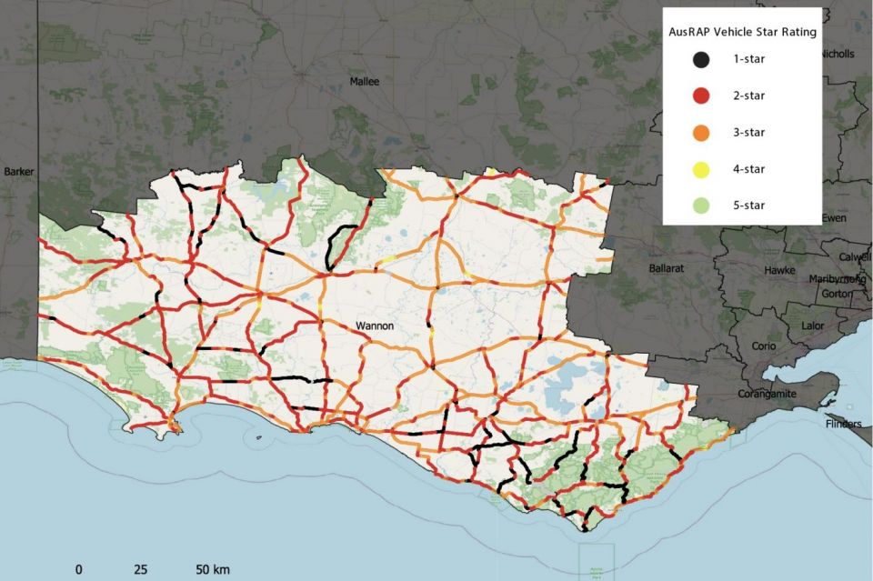The ratings show hundreds of kilometres of roads in western Victoria have received safety ratings of just one or two stars, the worst ratings.