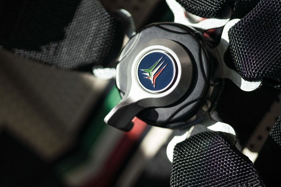 The Huayra Tricolore is a tribute to 60 years of the Freece Tricolori (“tricolour arrows”), an aerobatic demonstration team in the Italian Air Force.