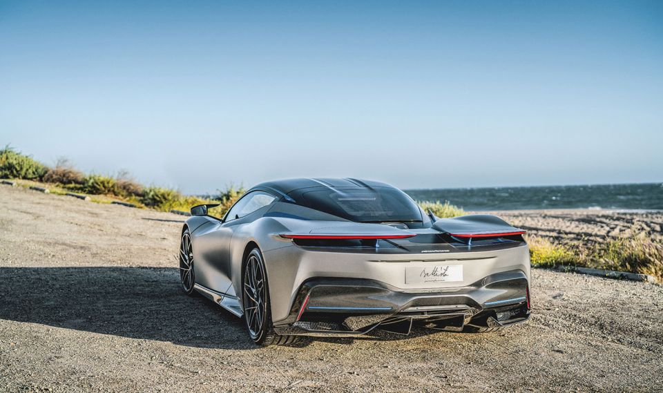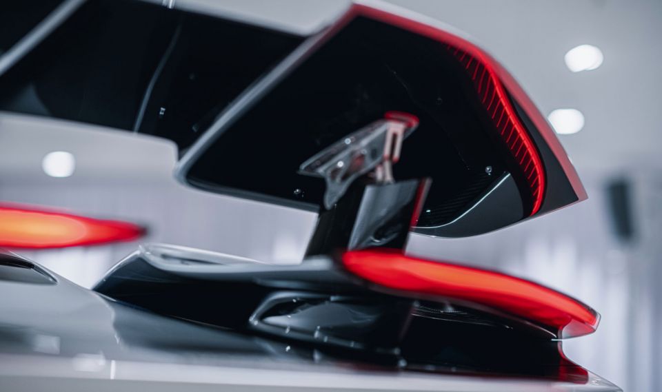The rear wing appears to be two finely-sliced pieces capped by LED lights, but is in fact a single unit joined by an ultra-thin carbon fibre bridge. Not only does it provide significant downforce, it acts as an air brake.