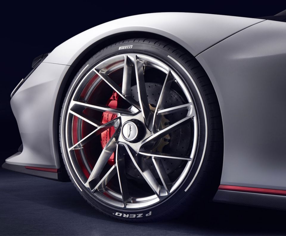 The Battista’s braking system is hugely powerful given the four individual electric motors driving each wheel. Carbon-ceramic discs measuring 390mm with six-piston calipers front and rear take care of the car’s stopping power.