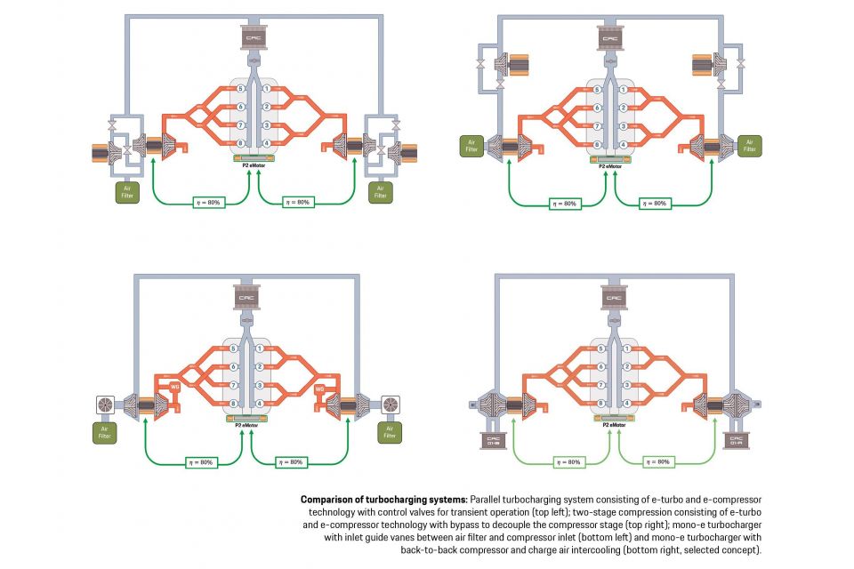 Some of those concepts are laid out in the diagrams above, each of which involves some combination of electric assistance for the compressor, variable intake vanes for the turbochargers, and different valve systems to allow the turbos to work in tandem.