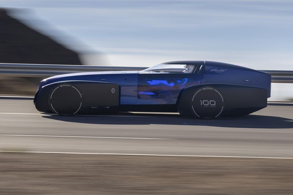 Renault says the design of the Filante Record 2025’s body is a homage to 40CV, a luxury sedan from 1925, and the Étoile Filante, a gas turbine-powered car from 1954 developed to set a world land speed record at the Bonneville Salt Flats in Utah.