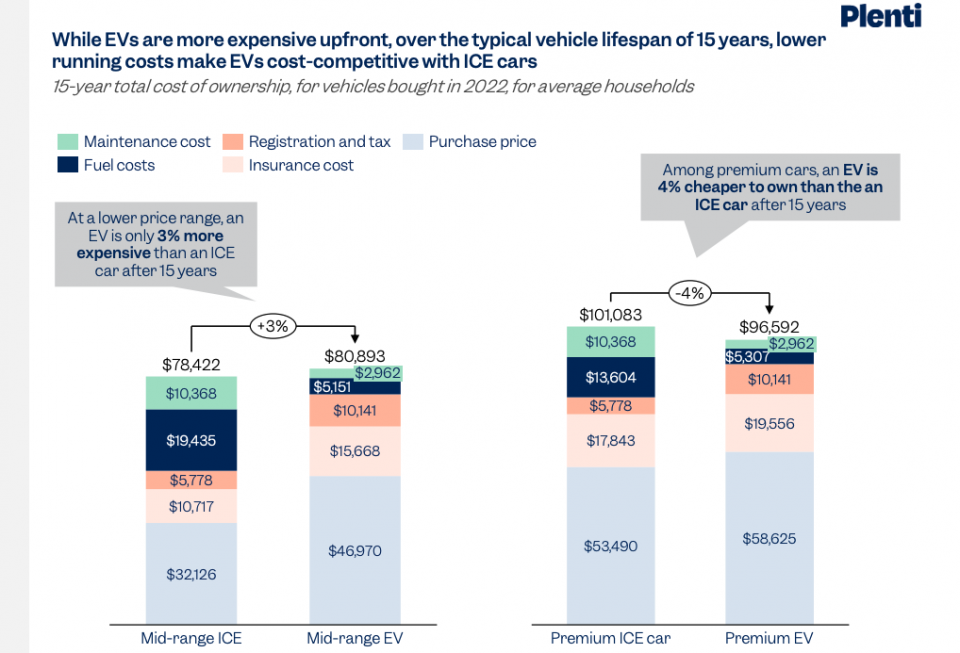One example scenario given compares “mid-range” EVs and ICE cars and found the overall cost after 15 years almost the same.
