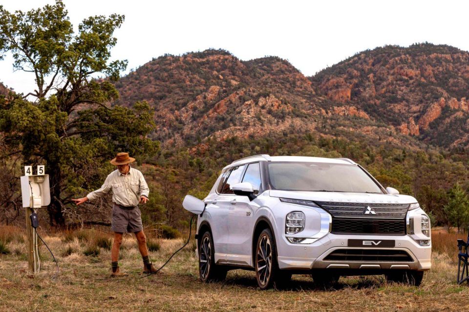 “Hoo-roo range anxiety,” Mitsubishi declares, claiming the Outlander PHEV “can drive to the back of Bourke and beyond”.