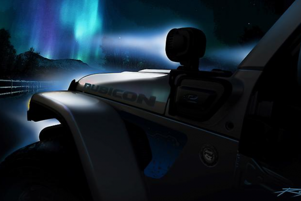 This Wrangler is shown in the night under the Northern Lights and near some snow-capped mountains, which could suggest the concept could be suited for colder climates.
